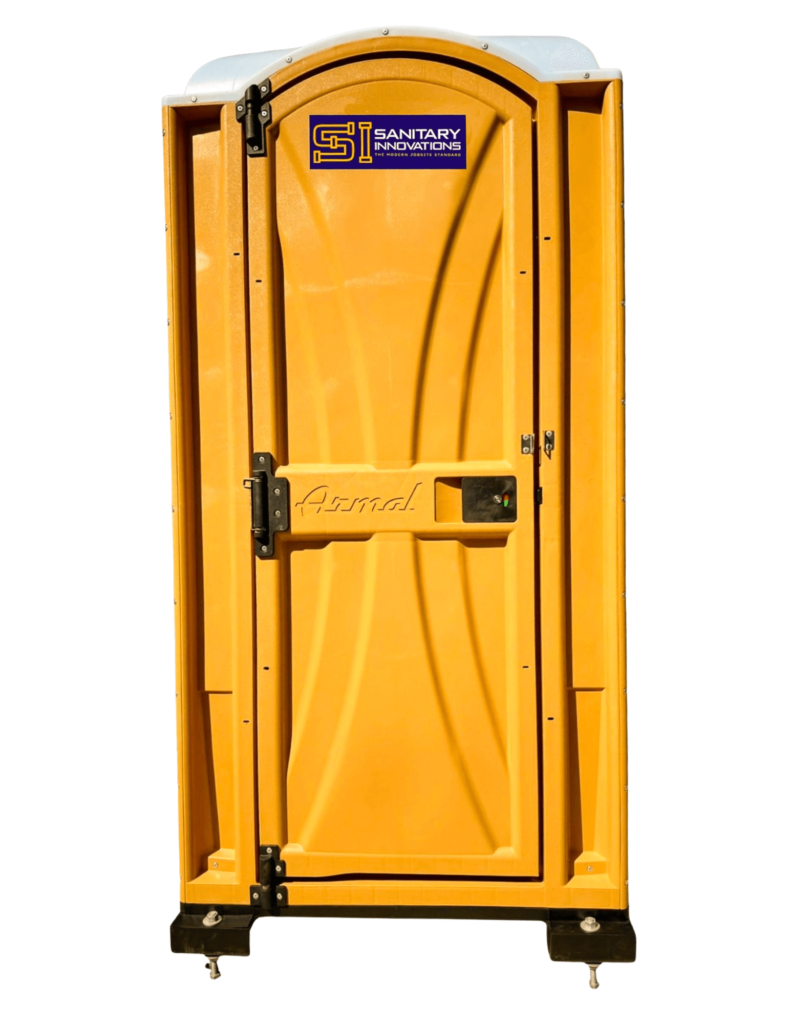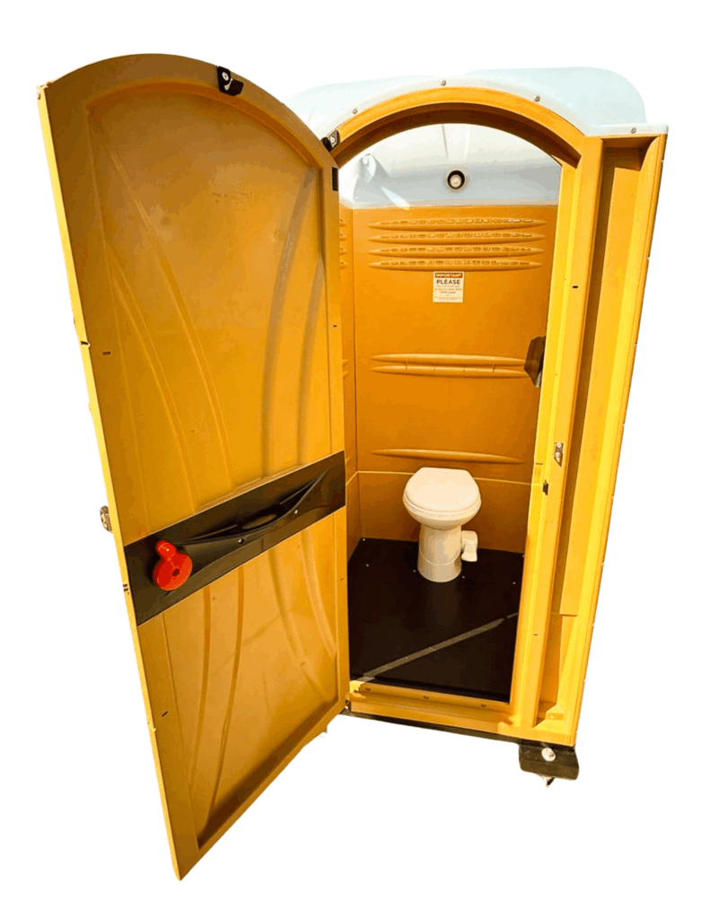 The unit utilizes the familiar, durable shell of a traditional portable toilet, but replaces the standard holding tank system with a gravity-fed, tankless flushing toilet. Unlike conventional port-o-potties that rely on collection tanks requiring frequent servicing, this system connects directly to a building’s temporary or permanent sanitary stack during construction, or to municipal sewer infrastructure when deployed at ground level.